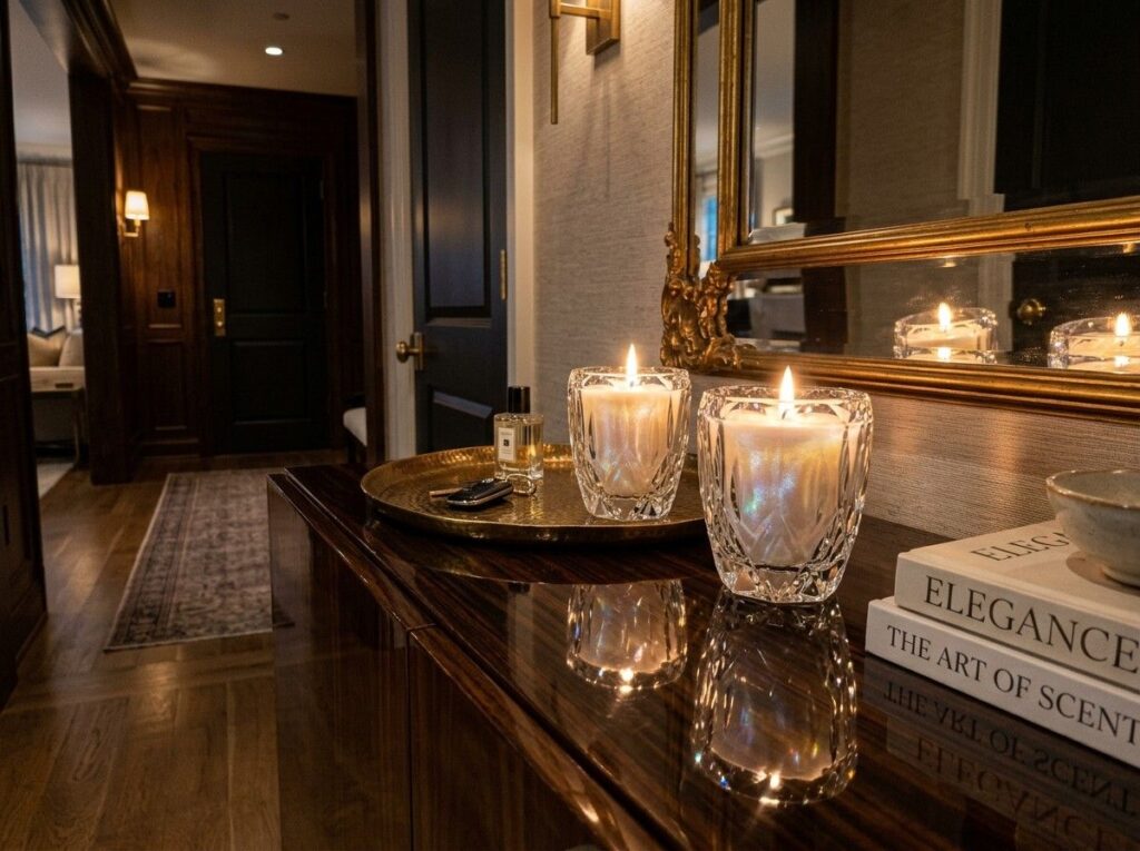 Decorative candle holders made of stone, metal, or glass can enhance the style and give the foyer a more upscale vibe.