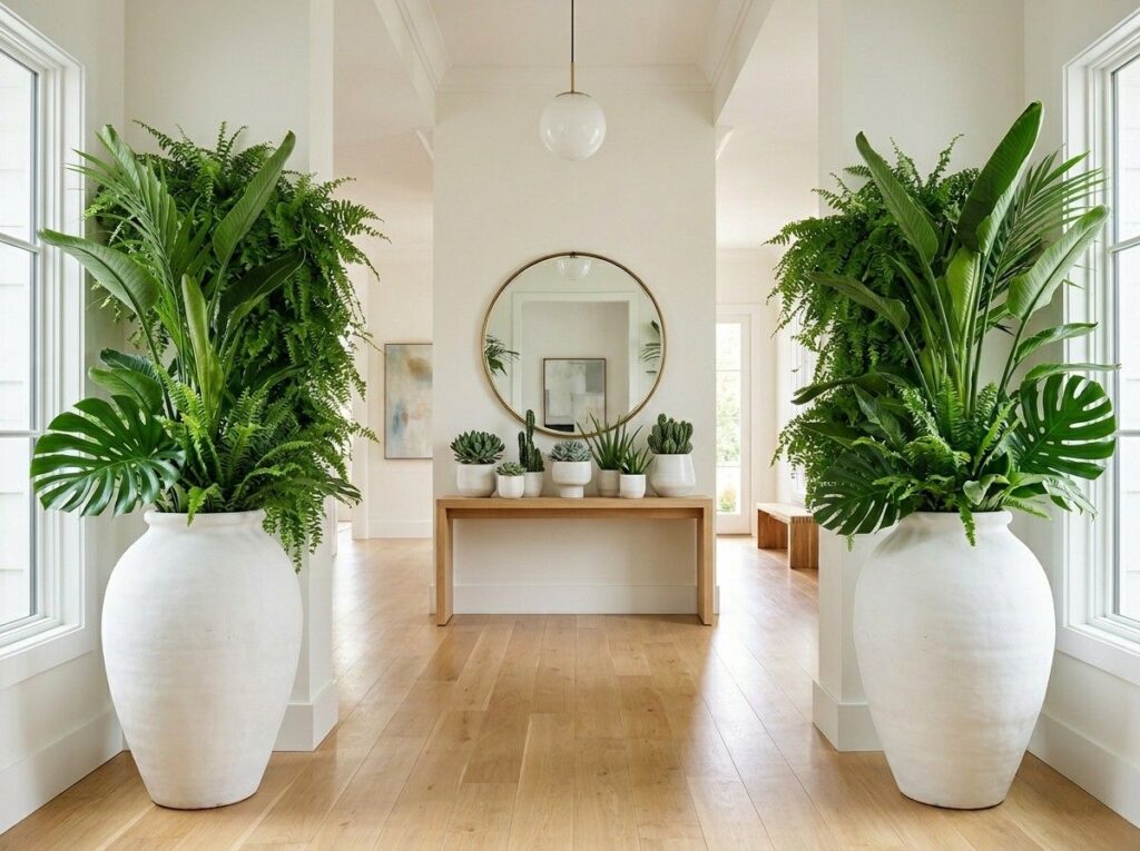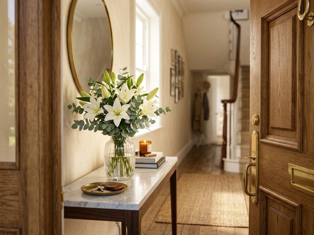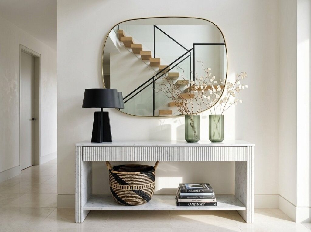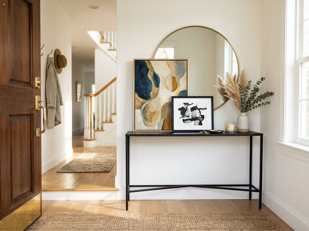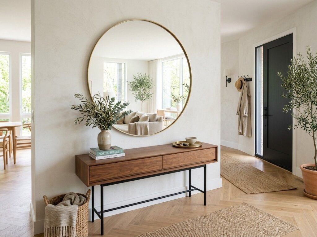 The room feels suddenly brighter and more roomy when a large mirror is positioned above the entryway table. Natural light is reflected by mirrors, making modest entryways seem more spacious and welcoming.