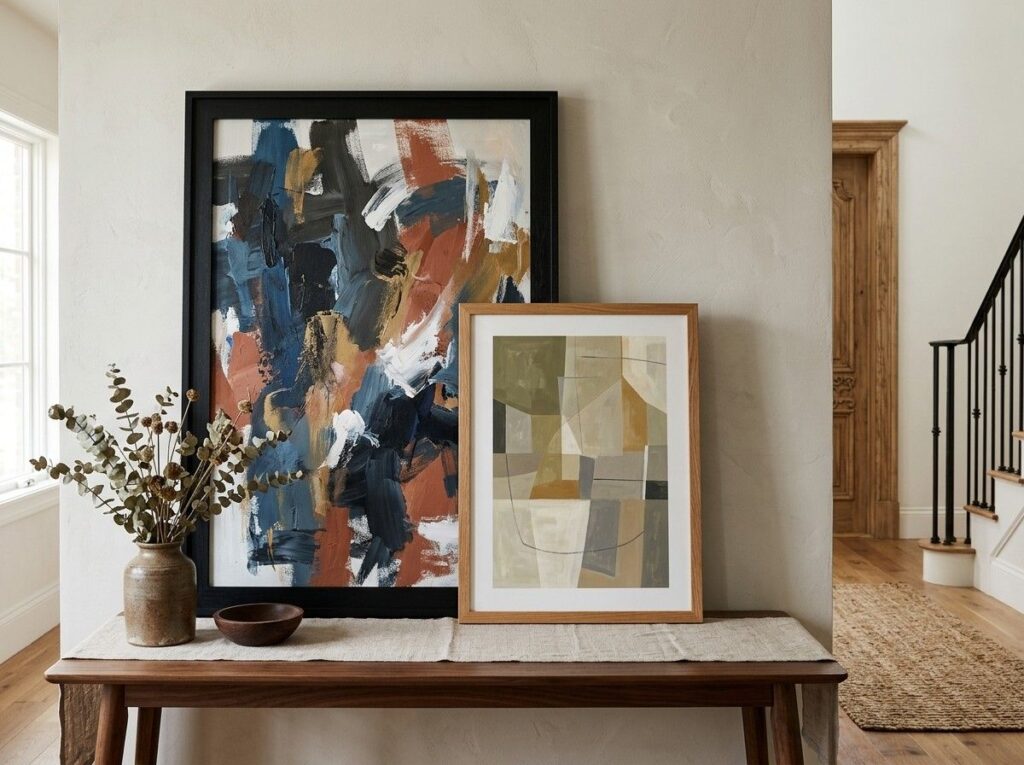 Try leaning framed paintings against the wall on the foyer table rather than hanging artwork directly on the wall. This multi-layered appearance adds complexity and originality.