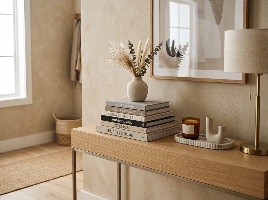A chic layered impression can be achieved by piling a few ornamental books on the foyer table. Books can be used as a foundation for additional decorative elements and add height variety.