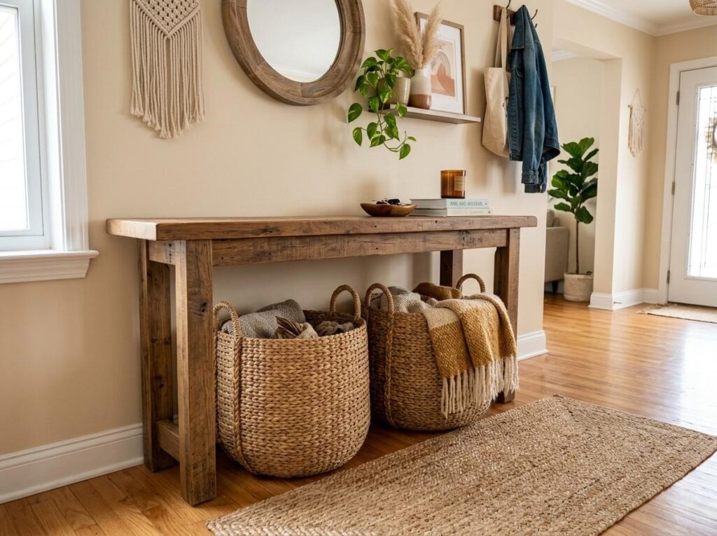 Additionally, woven baskets provide warmth and texture, making the doorway feel more utilitarian and balanced.