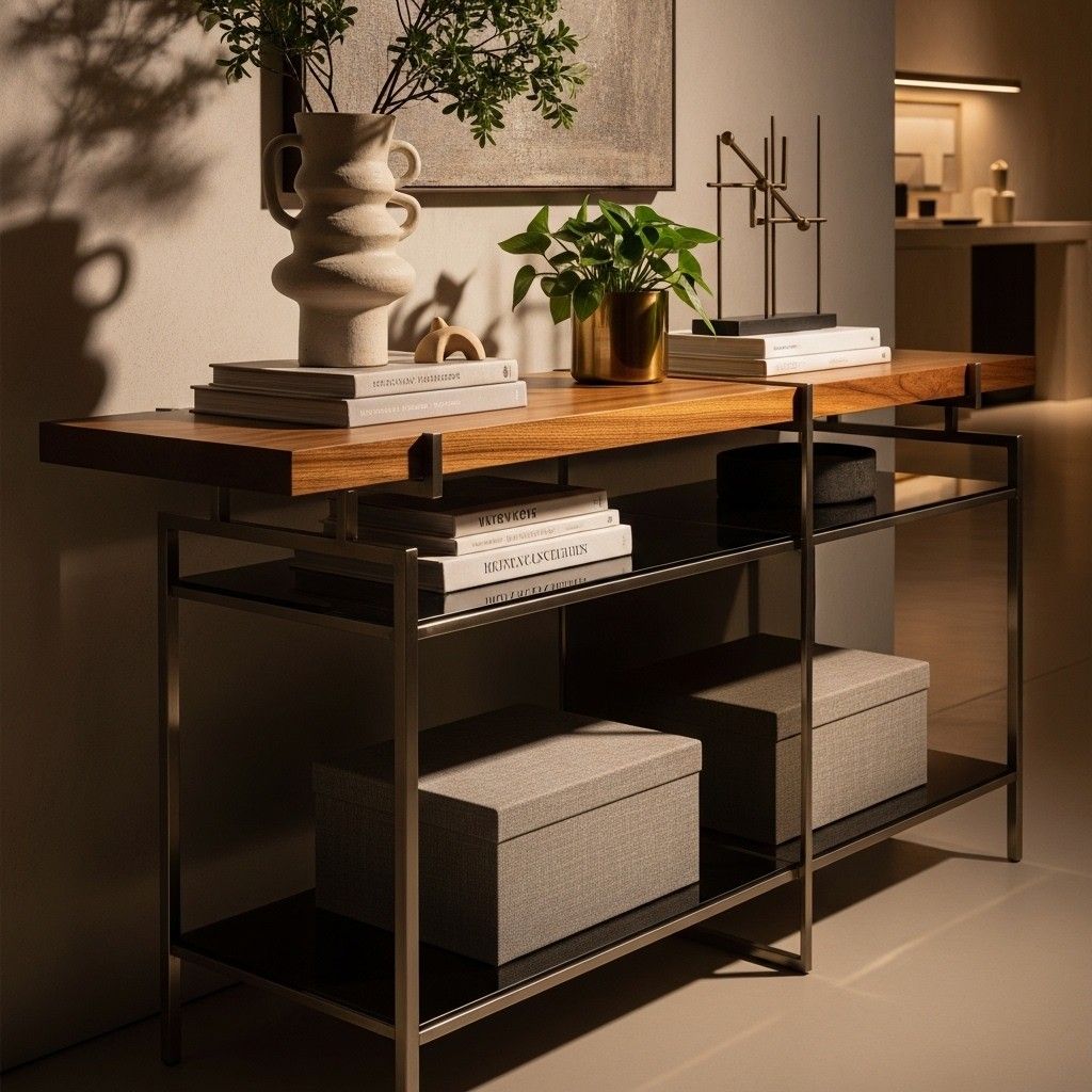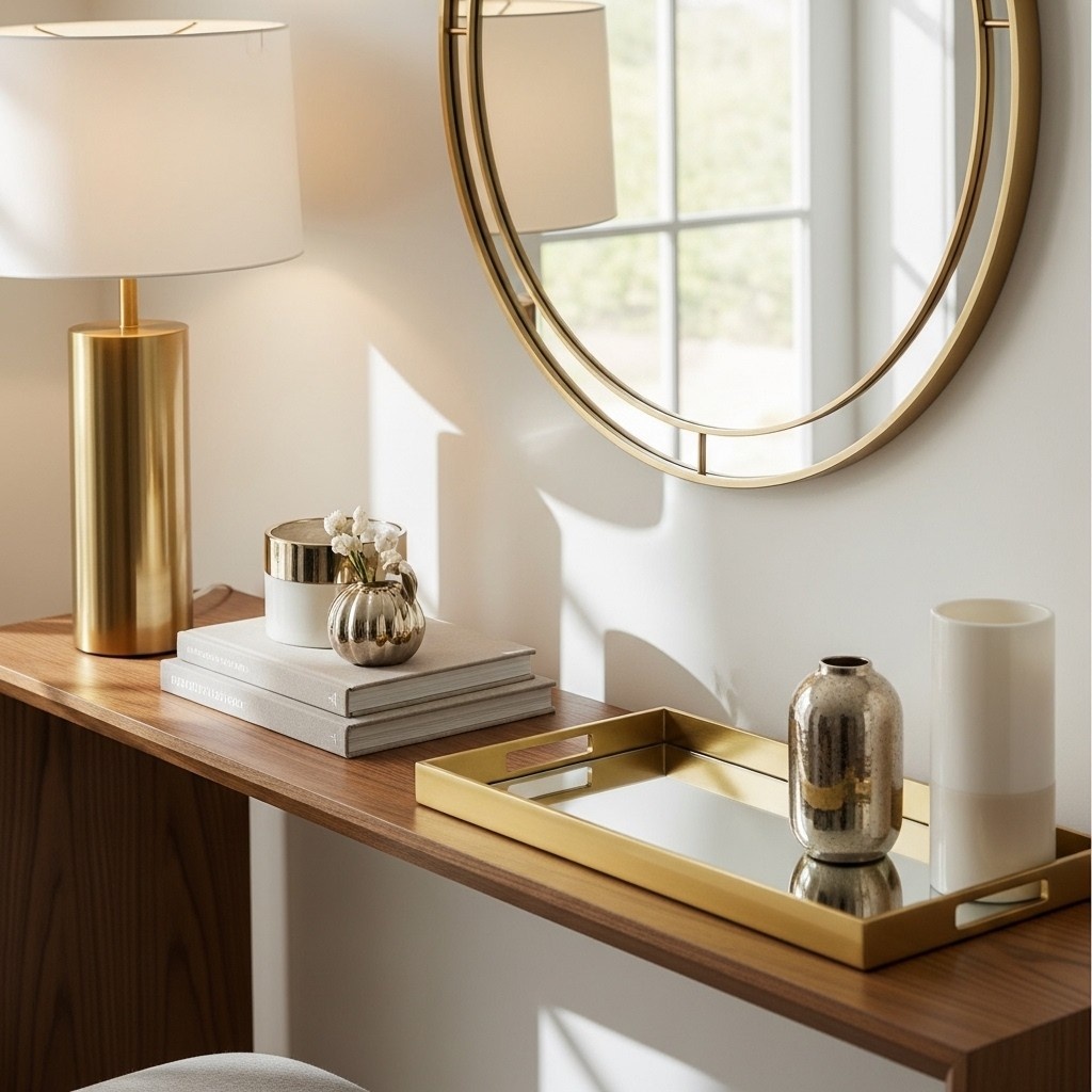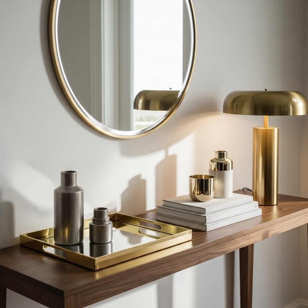 The entryway table is made more opulent by metallic accents like brass, silver, or gold décor pieces.