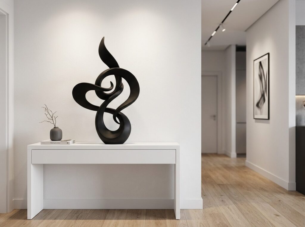 The table takes on an artistic quality when sculptural décor pieces like abstract figures or ceramic shapes are added.