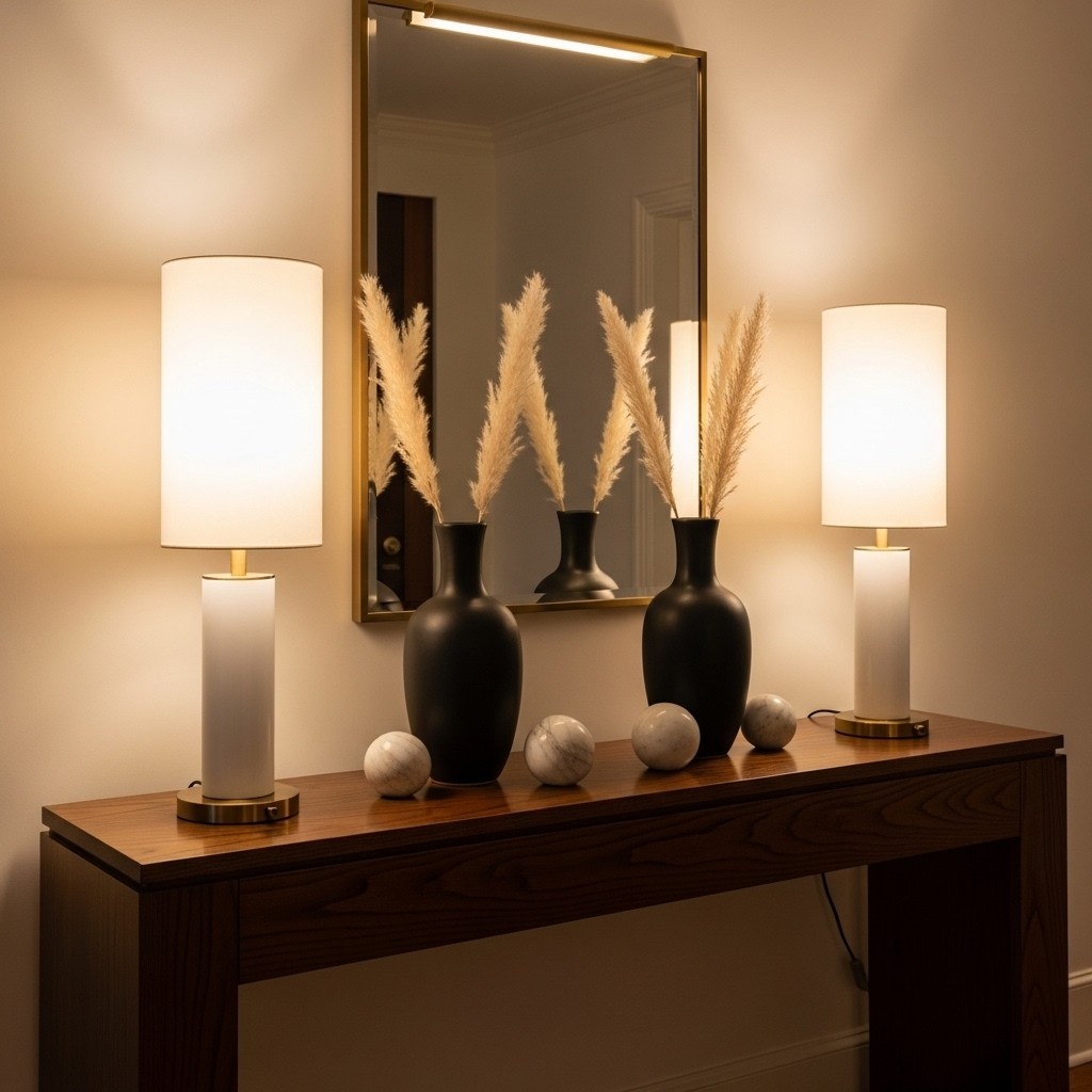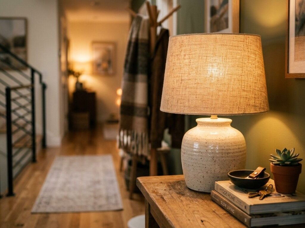 Select a lamp that goes well with the style of your property, such as textured wood for a farmhouse vibe or ceramic for a modern appearance. Particularly at night, the soft glow of a lamp contributes to the entryway’s cosiness.