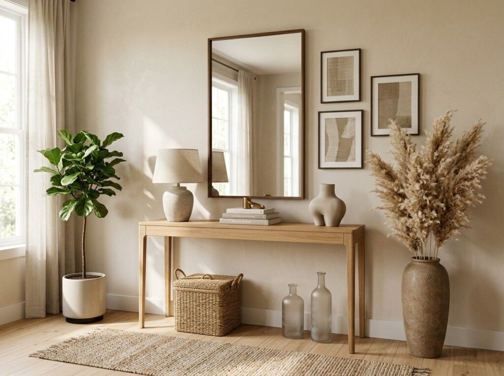 The entryway table gains height and optical balance when a tall floor vase is placed next to it. Add branches, pampas grass, or ornamental stems to fill it.