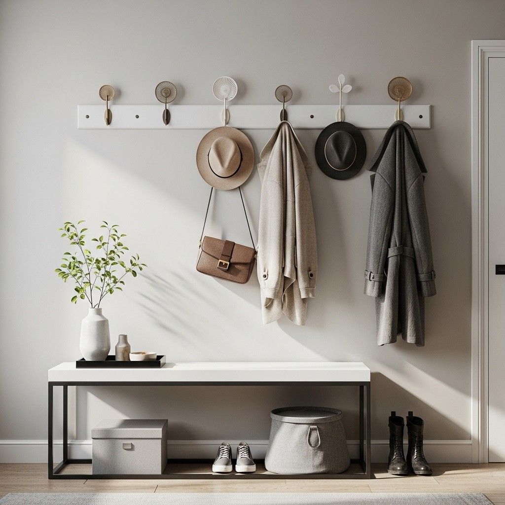 Wall hooks over the entryway table are a stylish and useful addition. They can accommodate hats, purses, and coats.